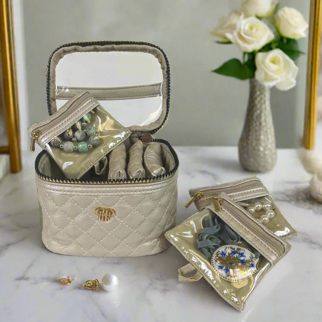 There is nothing more frustrating than misplacing one earring from a set you love. Our clear front removable pouches in our Pearl Getaway Jewelry Case are the solution. Keep your earrings, rings, bracelets and more neatly organized and easy to see. It is the perfect travel case for keeping small to medium jewelry from getting lost or tangled at home or on-the-go. This is one of our customer favorites.