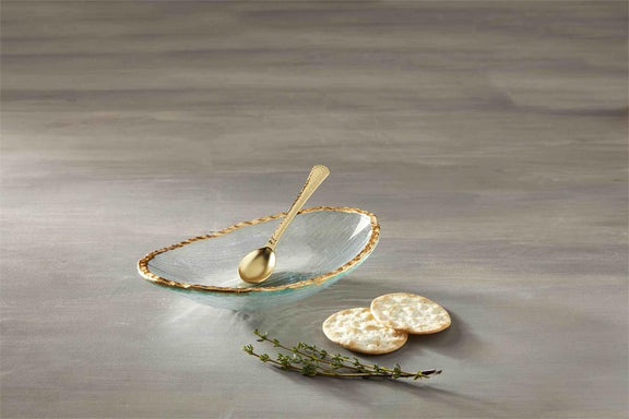 2-piece set. Glass dip bowl with gold raw edge. Comes with brass plate spoon.