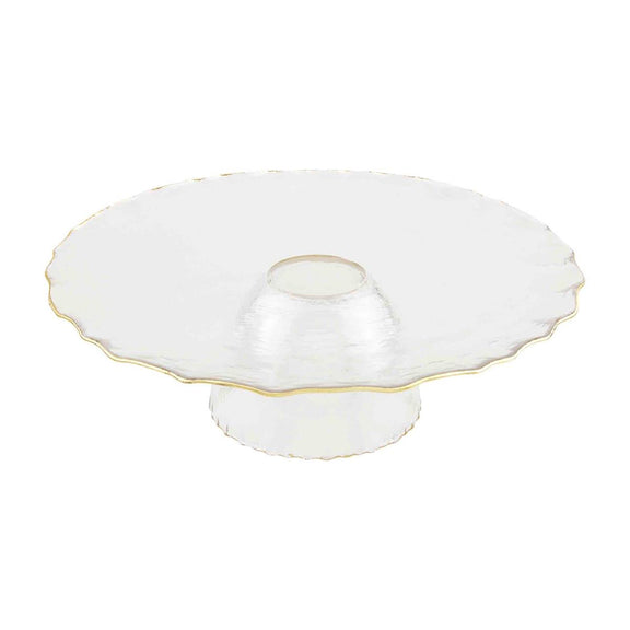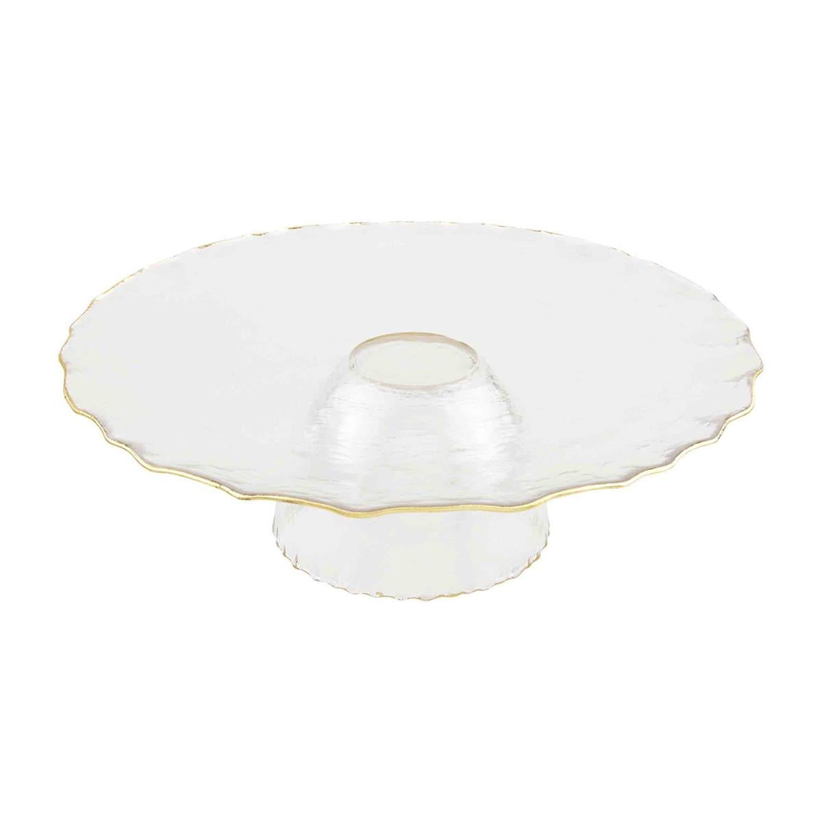 Glass chip server with gold edge and attached center dip cup. Flip server over and use as pedestal server base.