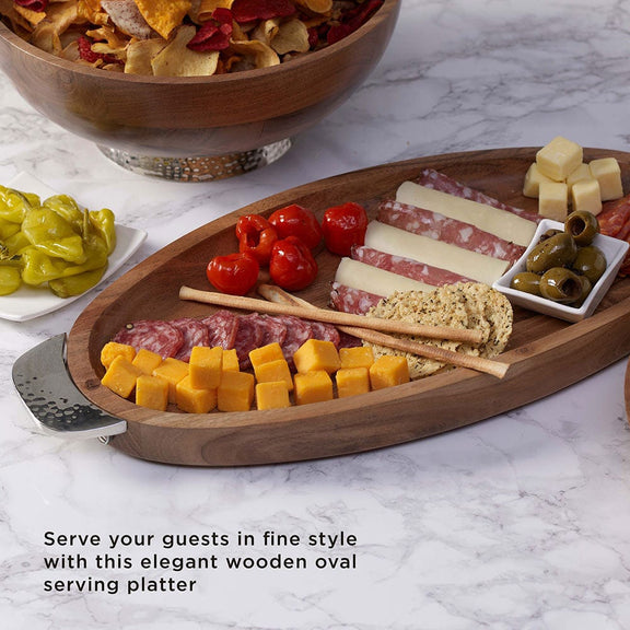 This Towle Hammersmith Wood Oval Platter is beautifully crafted of acacia wood, with hammered metal alloy handles. Perfect for serving your guests in style, and will add elegance and sophistication to your table.