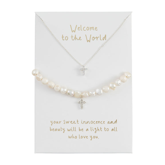 Welcome a sweet little one with a sparkling gift of jewelry. The boxed set includes a stunning pearl bead bracelet, beautifully adorned with a petite pavé cross charm in a comfortable 2" diameter. With an adjustable chain, the 14" long necklace features a coordinating pavé cross charm. Whether for a baby shower, baby sprinkle, christening or baptism, this delicate set comes in beautiful ready-to-gift packaging.