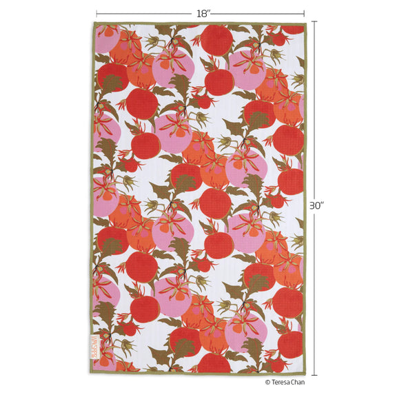 This reversible microfiber kitchen towel showcases a variety of baking tools on one side, and a coordinating strawberry pattern on the other. A versatile and stylish complement to any decor.