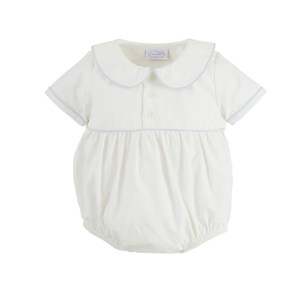 The contrast piping enhances the overall design, providing a subtle yet stylish accent. Designed for both comfort and convenience, this bubble includes inner leg snaps, making diaper changes a breeze.