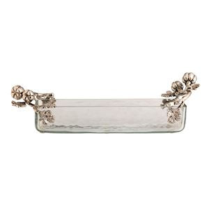 Glass cracker dish features cast aluminum pumpkin side handles.