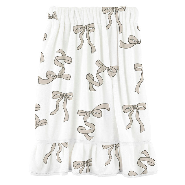 Blissfully cozy, Bella's plush spa wrap is the ultimate apres-shower delight. With ultra-soft fabric and a sweet ruffle accent, you won't want to get dressed. Never again will your towel slip off while blow drying your hair or applying makeup. Our best-selling spa wraps are a must for the graduate, bridesmaid, new mom, or girlfriend. These spa wraps are made with a soft elastic band across the back and finished with a Velcro closure in front.